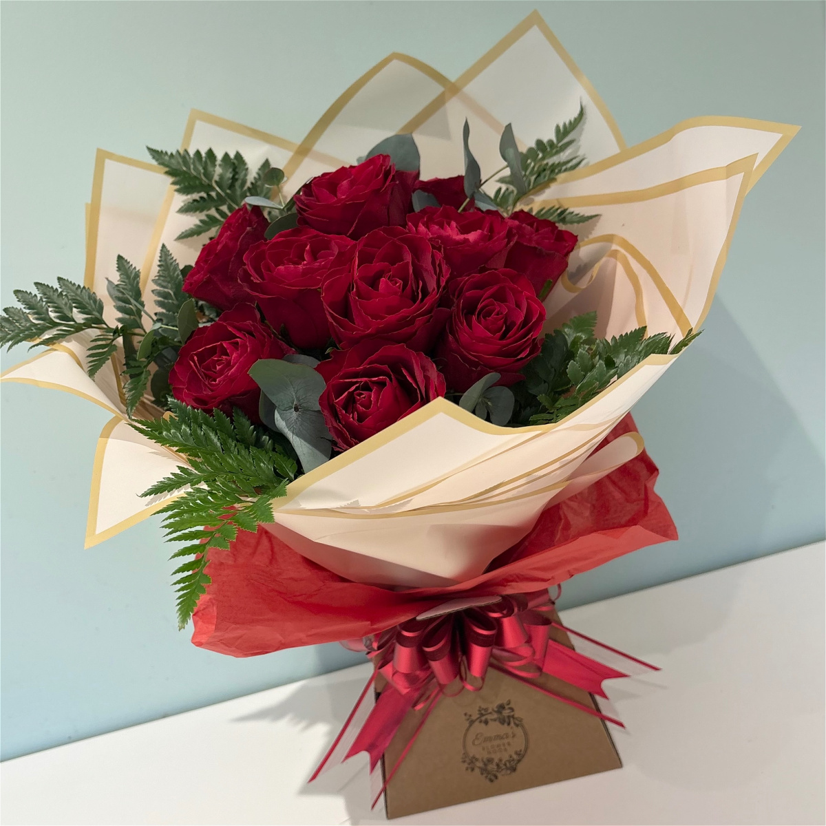 Luxury red roses mixed with eucalyptus and edged with leatherleaf foliage.
